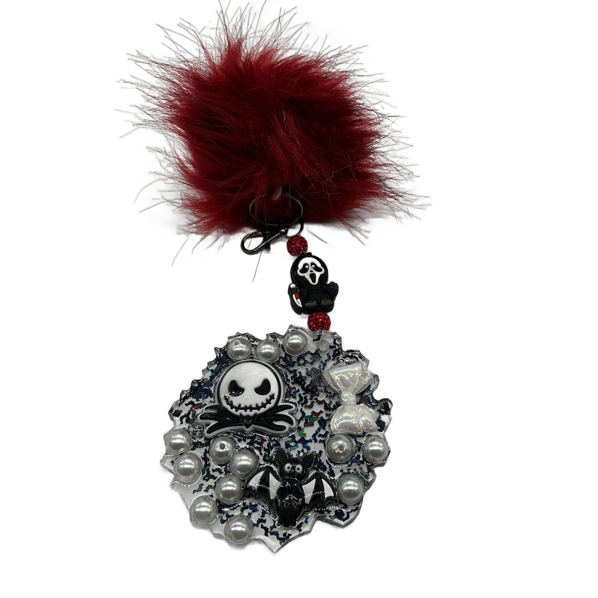 This resin keychain boasts a bold red pom-pom, complemented by a Jack Skellington-themed pendant embellished with silver pearls and beads, adding a touch of Nightmare Before Christmas flair.